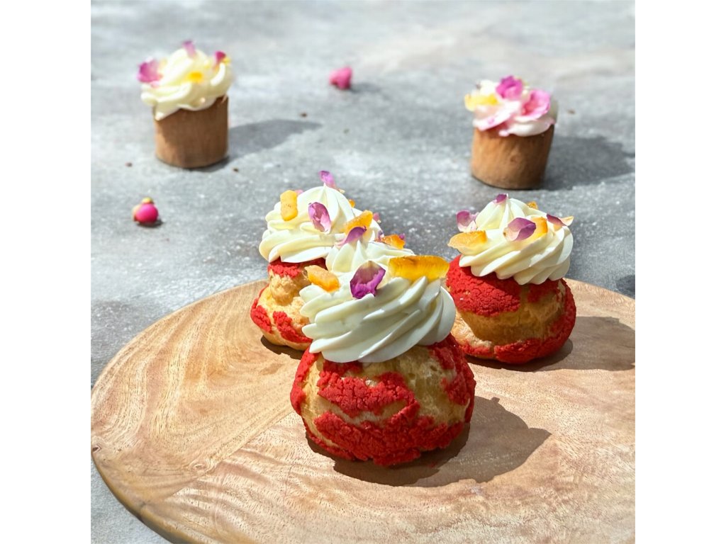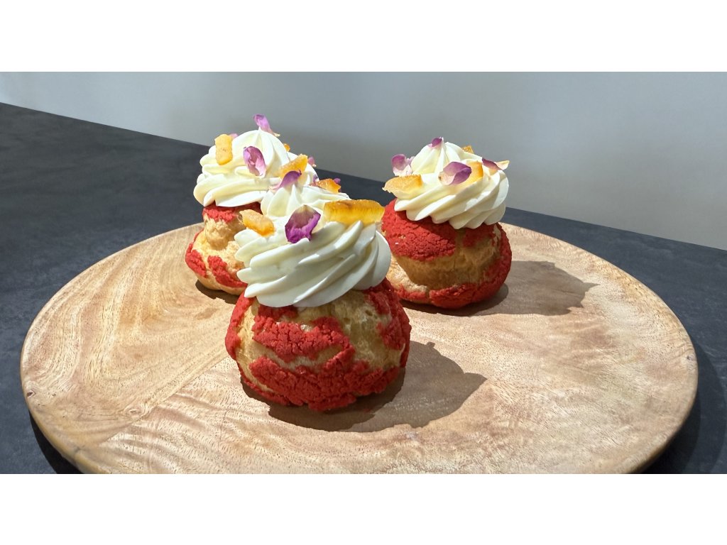 Francouzské větrníky choux s red velvet craquelinem, pomerančový krém s růží